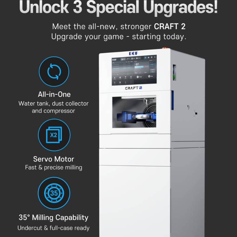 CRAFT 2 е ново поколение машина за фрезоване на DOF, създадена да осигури по-висока скорост, по-голяма прецизност и по-ефективен работен процес в сравнение с предходни модели като Craft 5X. Благодарение на модерната си конструкция и оптимизираната механика, машината предлага по-стабилна работа, по-бързо производство и по-голяма надеждност при ежедневна лабораторна употреба.
